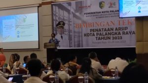PALANGKA RAYA. Tambunbungai.com – Wali Kota Palangka Raya Fairid Naparin diwakili Pelaksana Tugas (Plt) Asisten III Bidang Administrasi Umum Setda Kota Palangka Raya Akhmad Fordiansyah secara resmi membuka kegiatan Bimtek Penataan Arsip Kota Palangka Raya Tahun 2023, bertempat di Hotel Luwansa Palangka Raya, Kamis (22/6/23). Adapun maksud dan tujuan diadakannya Bimbingan Teknis Penataan Arsip Kota Palangka Raya Tahun 2023 ini adalah untuk mendorong instansi melakukan ada peserta di pengelolaan arsip terjaga yang instansinya.