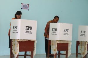 PURUK CAHU. Penjabat Bupati Kabupaten Murung Raya Hermon bersama Ketua TP-PKK Kabupoaten Murung Raya Melsi Hermon melakukan pencoblosan di Tempat Pemungutan Suara (TPS) 044, di Gedung TP-PKK Kabupaten Murung Raya Jalan Jenderal Sudirman, Kota Puruk Cahu, Rabu (14/2/2024).