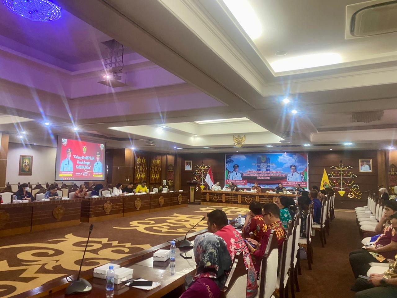 PALANGKA RAYA. Tambunbungai.com – Staf Ahli Gubernur Kalimantan Tengah (Kalteng) Bidang Ekonomi, Keuangan, dan Pembangunan, Yuas Elko, memimpin rapat optimalisasi dan sosialisasi Retribusi Daerah Tahun 2024 di Aula Eka Hapakat (AEH), Kantor Gubernur Kalteng, Jumat (20/12/24).